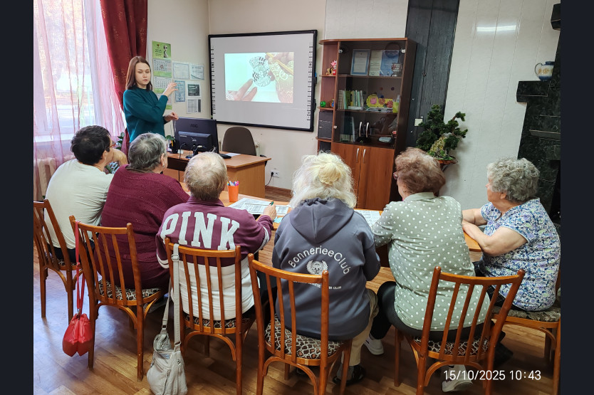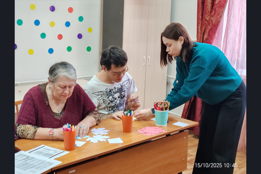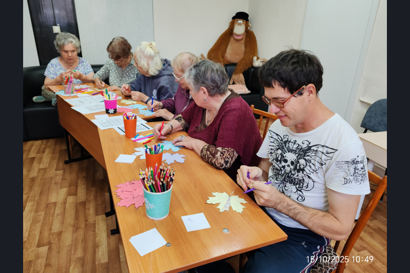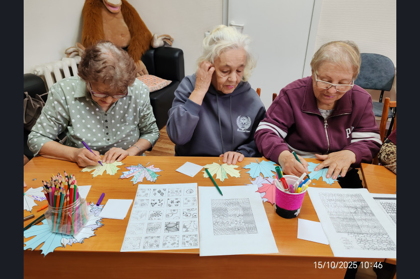 15 октября 2025 года в филиале «Отделение социальной реабилитации инвалидов» прошёл мастер-класс «Дудлинг для вдохновения». Техника дудлинга (от англ. doodle — «каракули») полезна для старшего поколения благодаря своему психологическому воздействию и физиологическим эффектам. Дудлинг — это бессознательный рисунок, выполненный во время какого-либо занятия, который не требует серьёзных художественных навыков. Педагог-психолог отделения Наталья Витальевна Балакина познакомила участников мастер-класса с особой графической техникой рисования, основанной на создании узоров из простых геометрических форм или хаотично пересекающихся линий, и предложила оформить осенний листок в данной технике. Все присутствующие активно включились в творческий процесс, создав уникальные рисунки.